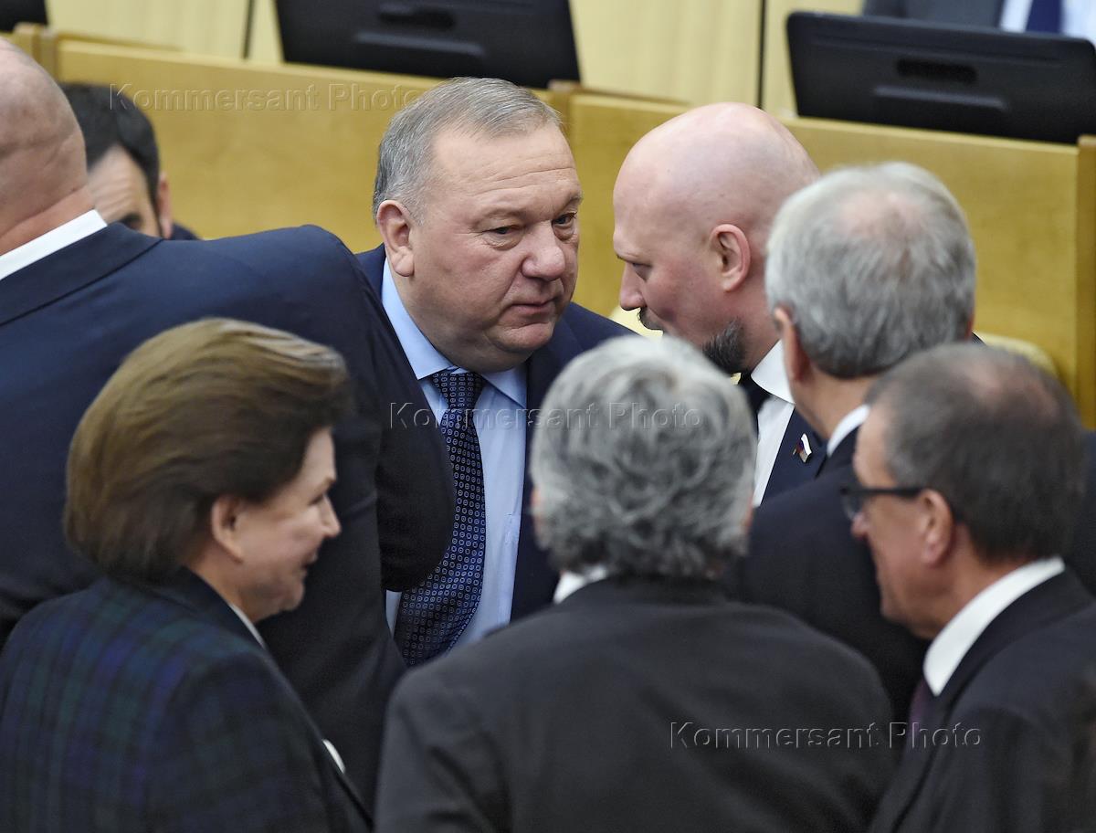 Пленарное заседание Государственной думы (ГД) России. Заместитель председателя комитета ГД России по международным делам Валентина Терешкова (слева) и председатель комитета ГД по обороне Владимир Шаманов (в центре) на пленарном заседании Госдумы.