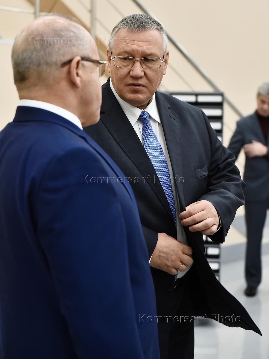 Церемония ввода новых производственных площадей Концерна "НПО "Аврора". Вице-губернатор Санкт-Петербурга Сергей Мовчан (справа) и генеральный директор Концерна "НПО "Аврора" Константин Шилов (слева) во время церемонии.