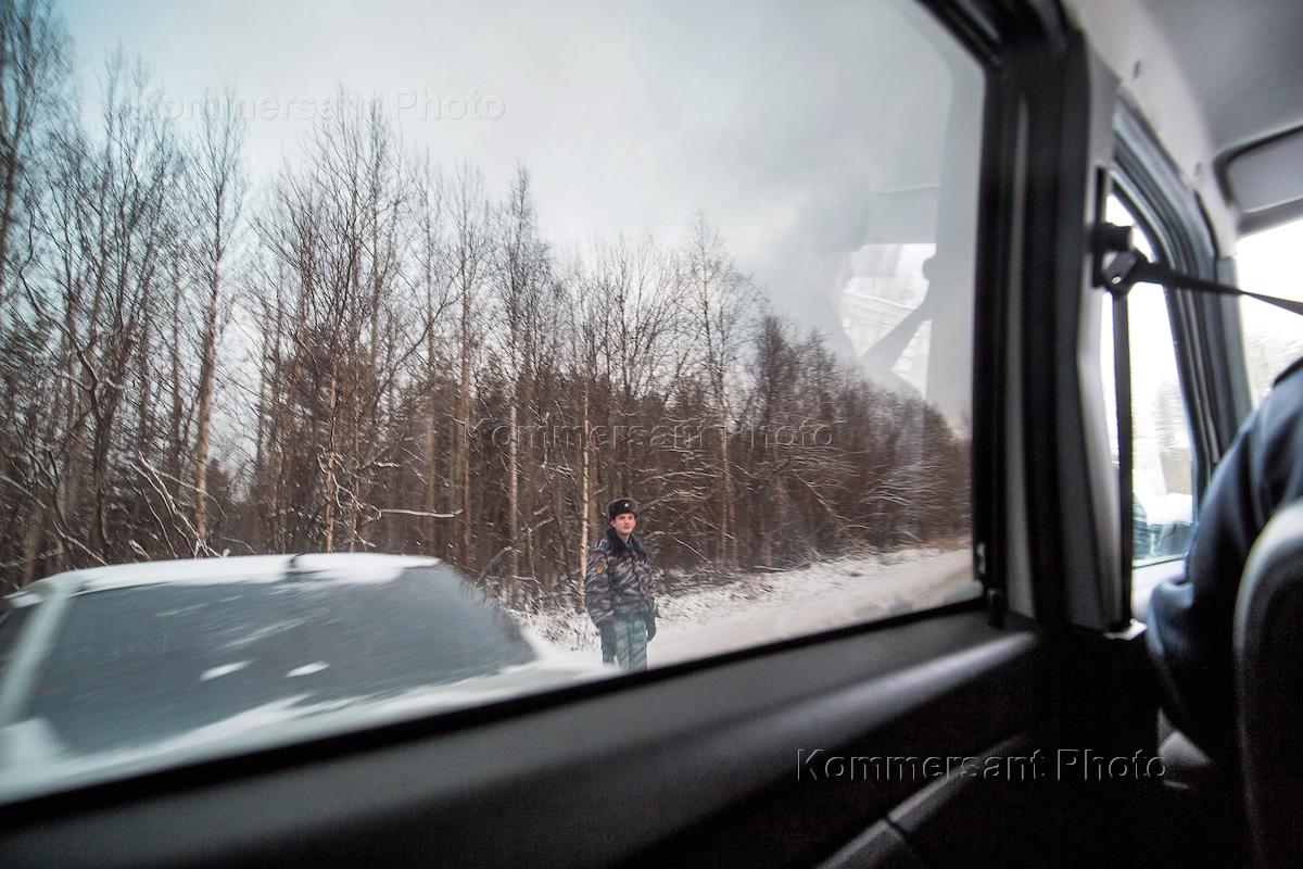 Сотрудник полиции из окна полицейской машины у колонии (ИК-7), где содержится Ильдар Дадин в городе Сегежа.