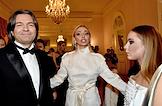 VI Бал Дебютанток журнала Tatler прошел в Колонном зале Дома Союзов. Справа налево: певица Инна Маликова, Анна Попова и руководитель ансамбля "Самоцветы" Юрий Маликов во время бала.