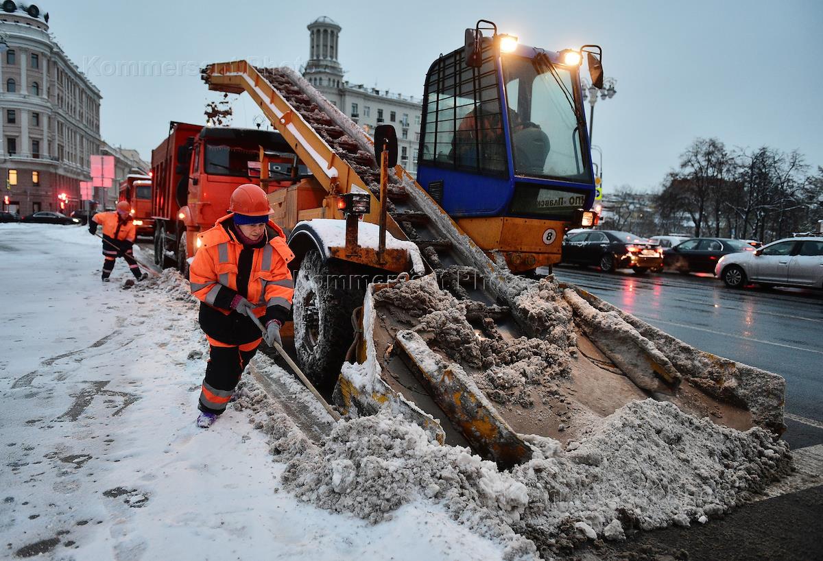 Жанровая фотография. Виды Москвы. Последствия ночного снегопада. Сотрудники коммунальной службы и спецтехника во время расчистки от снега проезжей части.