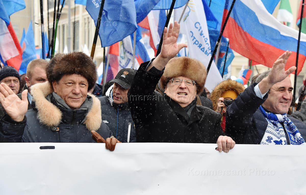 День народного единства. Праздничное шествие "Мы едины!" по Тверской улице. Слева направо: первый заместитель председателя Государственной думы (ГД) России Александр Жуков, лидер Либерально-демократической партии России (ЛДПР), член комитета ГД России по обороне Владимир Жириновский и заместитель председателя ГД России Сергей Неверов во время шествия .