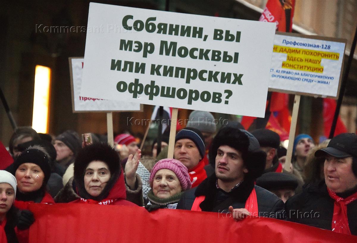 Шествие по Страстному бульвару, посвященные 99-й годовщине Великой Октябрьской социалистической революции, организованные Союзом Советских офицеров, Всероссийским женским движением "Надежда России" и Коммунистической партией России (КПРФ). Первый заместитель председателя Государственной думы (ГД) России Иван Мельников (сслева), лидер КПРФ, член комитета ГД по делам Содружества Независимых Государств, евразийской интеграции и связям с соотечественниками Геннадий Зюганов (в центре), председатель комитета ГД по аграрным вопросам Владимир Кашин (слева) во время шествия.|
