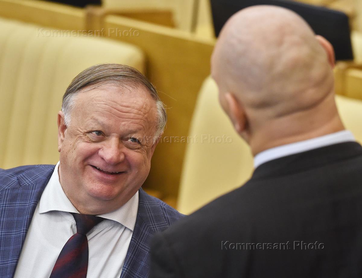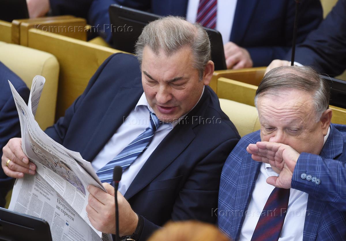 Пленарное заседание Государственной думы (ГД) России. Заместитель председателя комитета ГД России по обороне Виктор Заварзин (слева) и первый заместитель председателя комитета ГД России по экологии и охране окружающей среды Николай Валуев (справа) во время заседания.