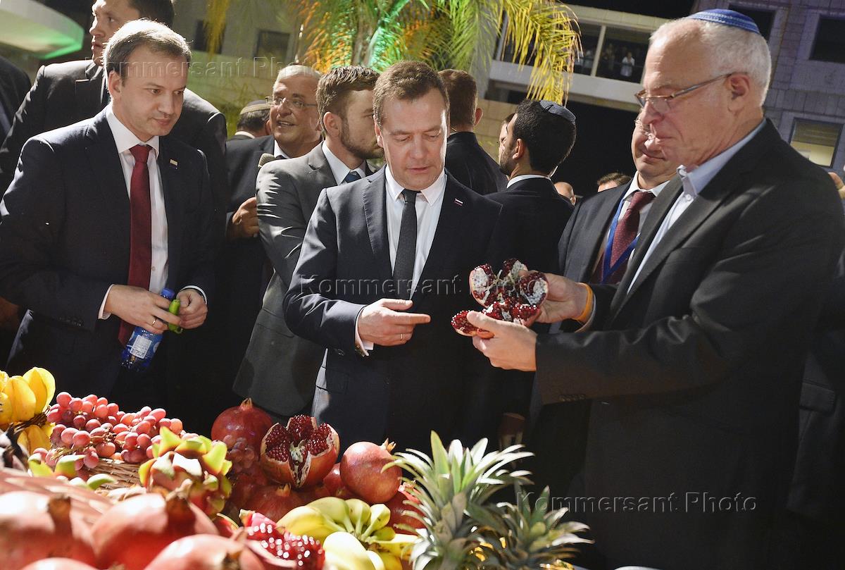 Russian Prime Minister Dmitry Medvedev (centre) greets President of the State of Palestine Mahmoud Abbas (second from left) during Medvedev's official visit to the State of Palestine.