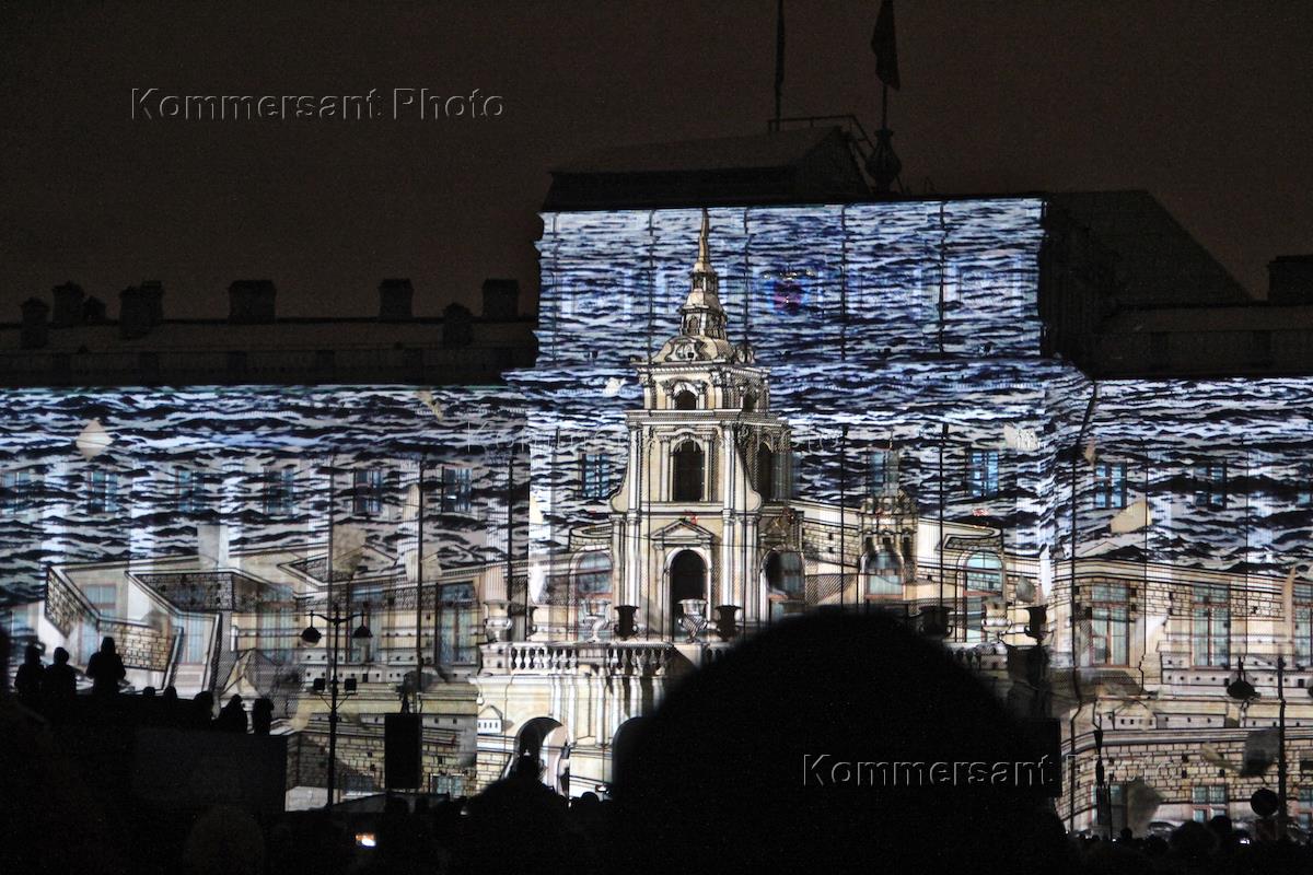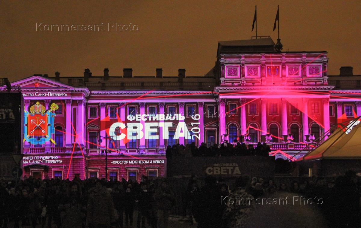 Фестиваль света. Мульмедийное 3D-mapping show и лазерная инсталяция на Исаакиевской площади на здании Мариинского дворца.