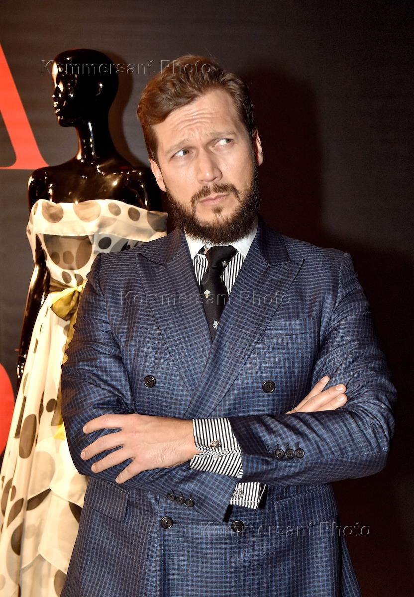 Празднование юбилея Модного Дома Carolina Herrera в ЦУМе. Художник Петр Аксенов во время мероприятия.