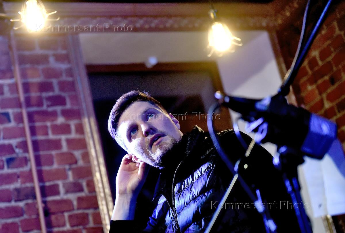 Музыкальный вечер в формате "квартирник" "Время легенд", организованный издательским домом "Коммерсантъ - Санкт-Петербург". Музыкант Федор Чистяков на вечере.