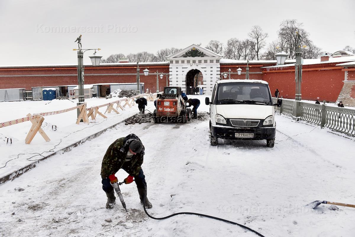 Souvenir ushanka-hats are sold near the Saints Peter and Paul Cathedral.