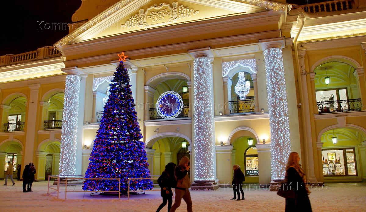Жанровая фотография. Виды Санкт-Петербурга. Новогодняя елка на Невском проспекте перед Гостиным двором в начале ноября.