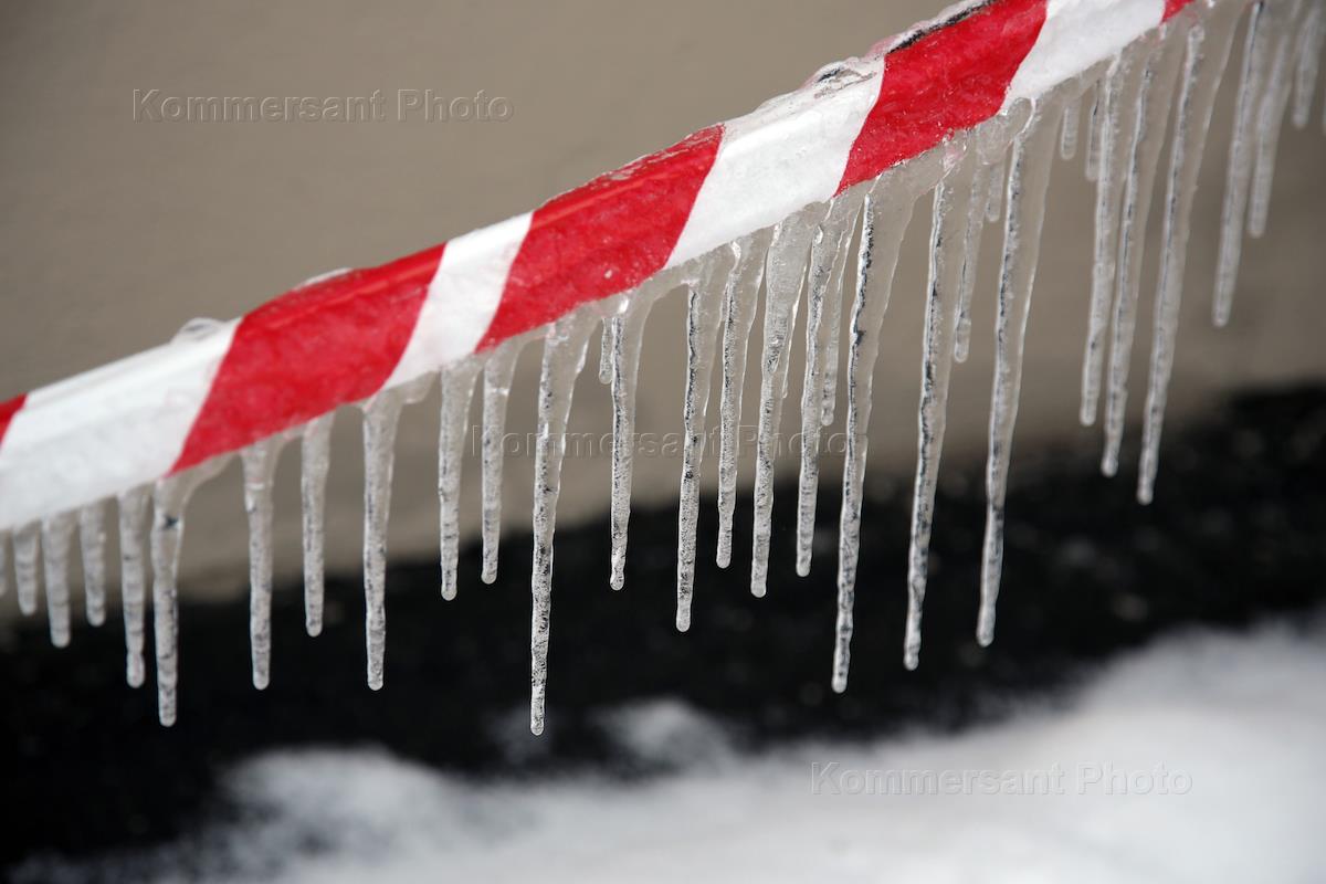 Жанровая фотография. Сосульки на сигнальной ленты для ограждения.