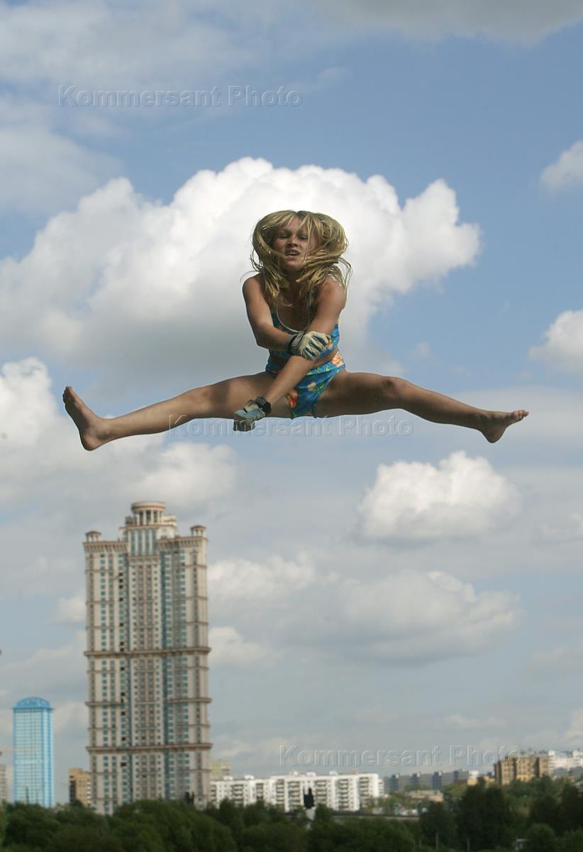 A girl soars up jumping on a trampoline at the Strogino Sports Centre.