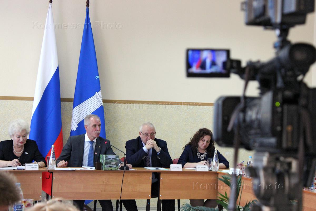 Совещание президиума регионального общественного движения "За советскую школу". Слева направо: заслуженный учитель России, директор гимназии № 44 Лидия Жуковская-Латышева, губернатор Ульяновской области Сергей Морозов, председатель Законодательного Собрания Ульяновской области Анатолий Бакаев во время совещания.
