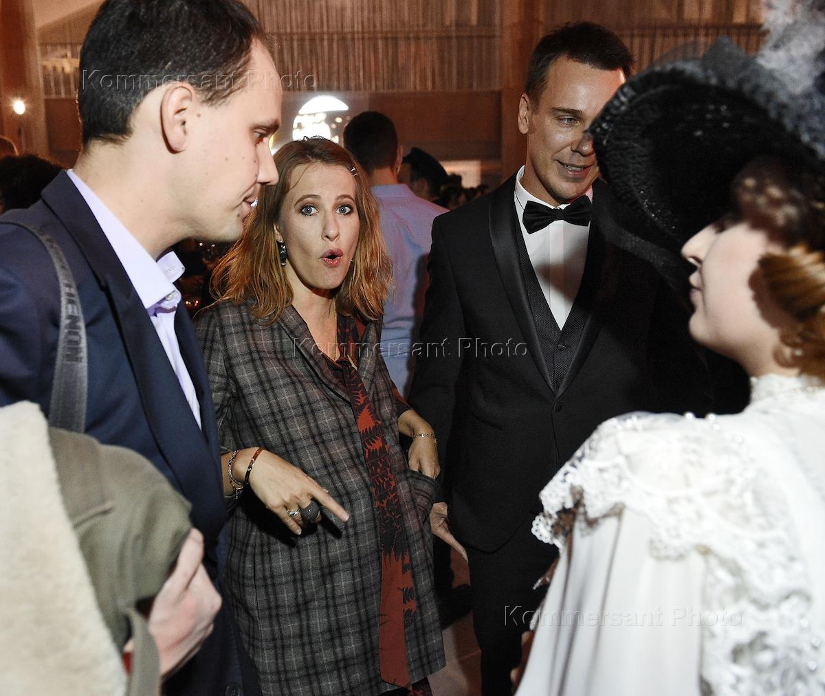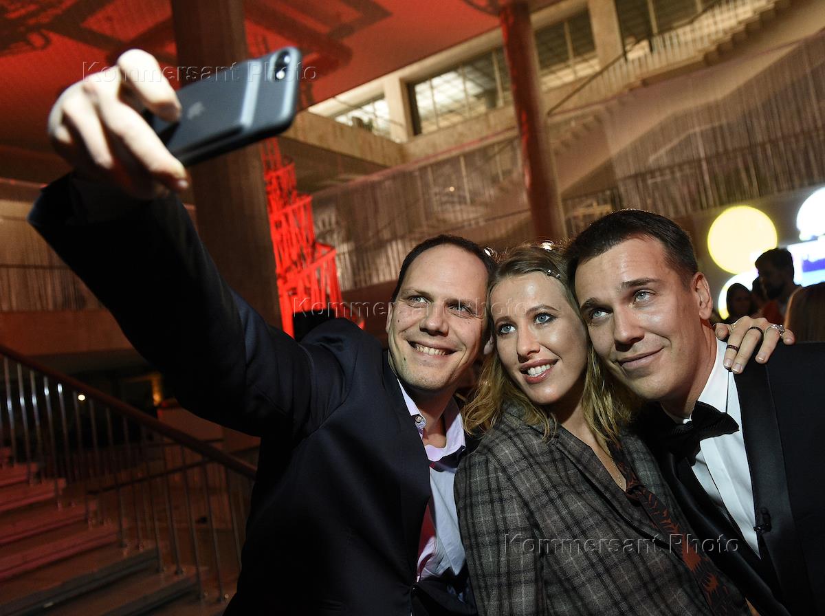 Cлева направо: журналист Антон Желнов, телеведущая, главный редактор русской версии журнала L'Officiel Ксения Собчак, журналист Михаил Зыгарь на вечеринке по случаю запуска проекта журналиста Михаила Зыгаря "1917. Свободная история" в Третьяковской галерее на Крымском Валу.