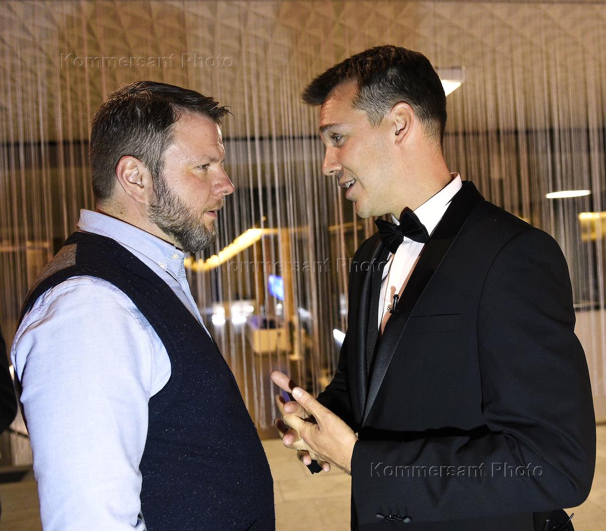 Журналист Максим Ковальский (справа) на вечеринке по случаю запуска проекта Михаила Зыгаря "1917. Свободная история" в Третьяковской галерее на Крымском Валу.