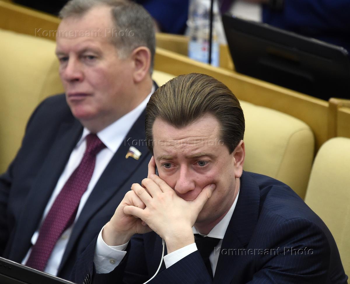 Пленарное заседание Государственной думы (ГД) России. Член комитета ГД России по экологии и охране окружающей среды Алексей Воевода (справа) во время заседания.