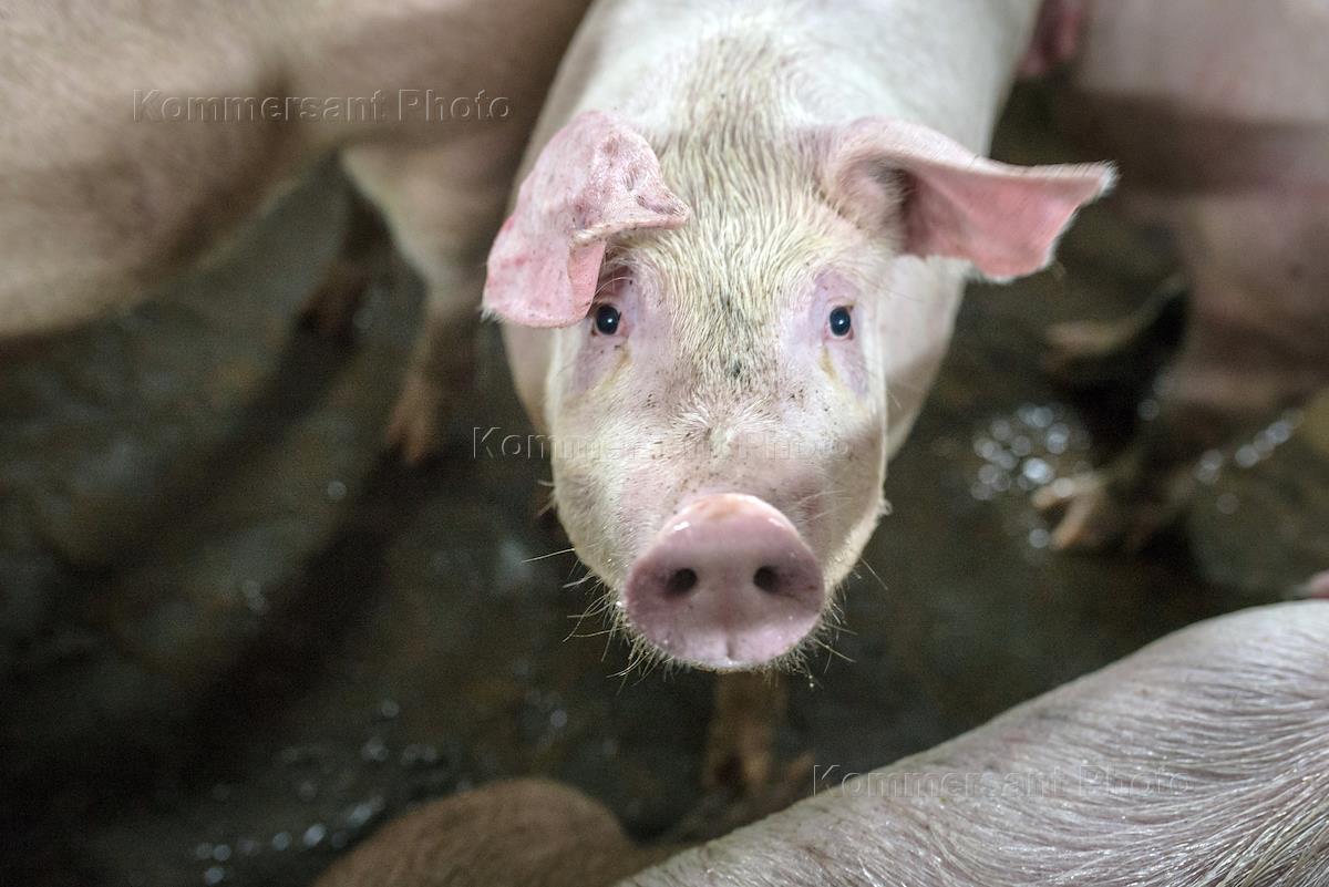 Предприятие по производству мраморной свинины "КапиталАгро". Свиньи в загоне перед отправкой в камеру с углекислым газом для усыпление перед убоем.