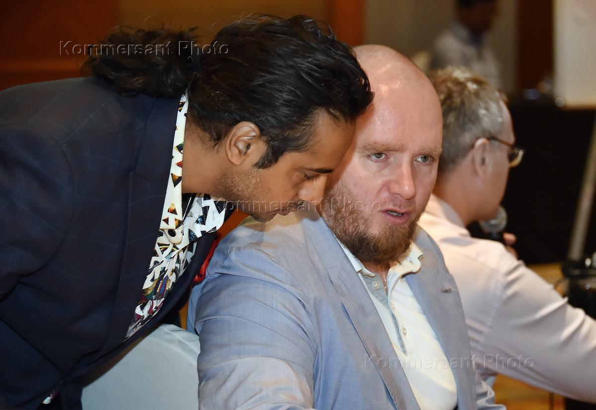 Кинофорум "Дни российского кино в Мумбаи". Заместитель председателя Союза кинематографистов России Олег Иванов (слева) и режиссер Алексей Петрухин (справа) на встрече с продюсерами индийских фильмов на "круглом" столе "Новые перспективы сотрудничества в сфере кино между Индией и Россией".