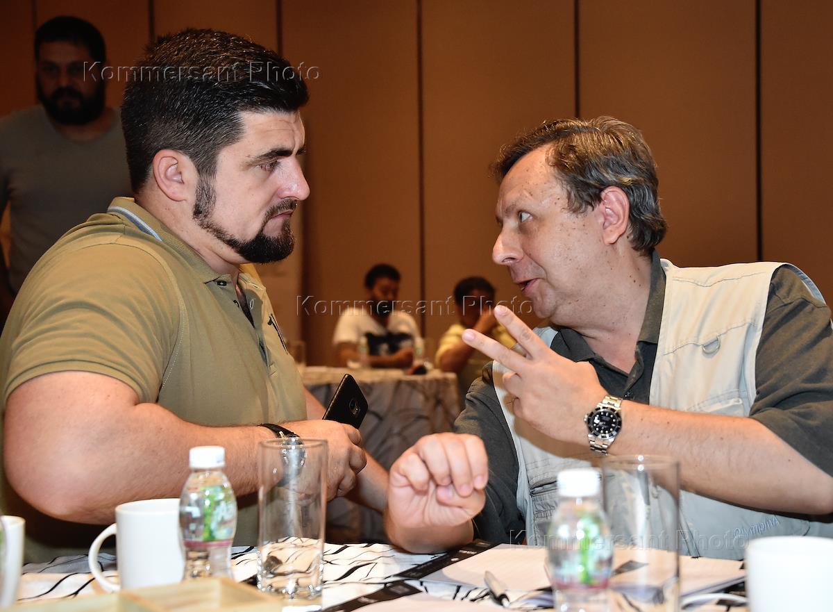 Кинофорум "Дни российского кино в Мумбаи". Режиссер Алексей Петрухин (слева) и заместитель председателя Союза кинематографистов России Олег Иванов (справа) на встрече с продюсерами индийских фильмов на "круглом" столе "Новые перспективы сотрудничества в сфере кино между Индией и Россией".