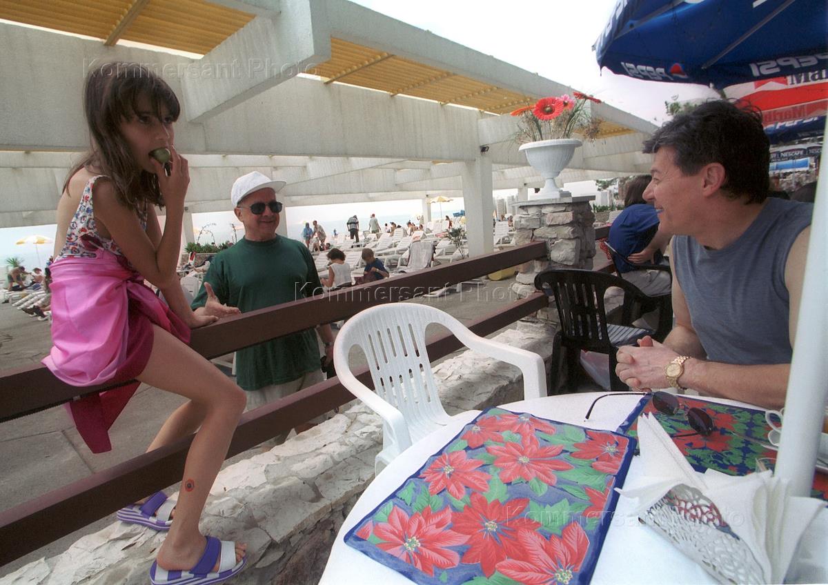 Открытый российский кинофестиваль "Кинотавр 2000". Актеры Александр Збруев (слева) и Арчил Гомиашвили (в центре) с внучкой в летнем кафе на пляже города Сочи.
