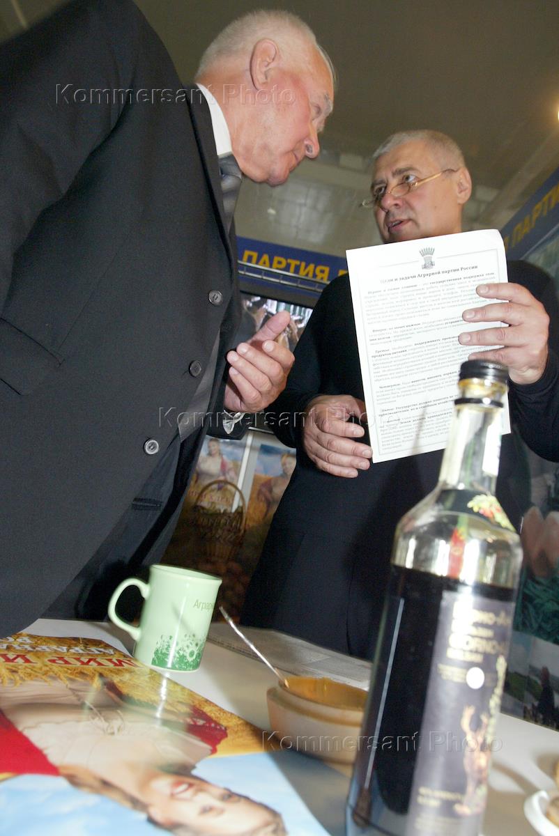 Chairman of the Russian Agricultural Party, Altay Kray Governor Mikhail Lapshin (left) talks to political scientist, head of the Effective Policies Foundation Gleb Pavlovsky at the political parties fair 'Election 2003' held in the Manezh exhibition centre.