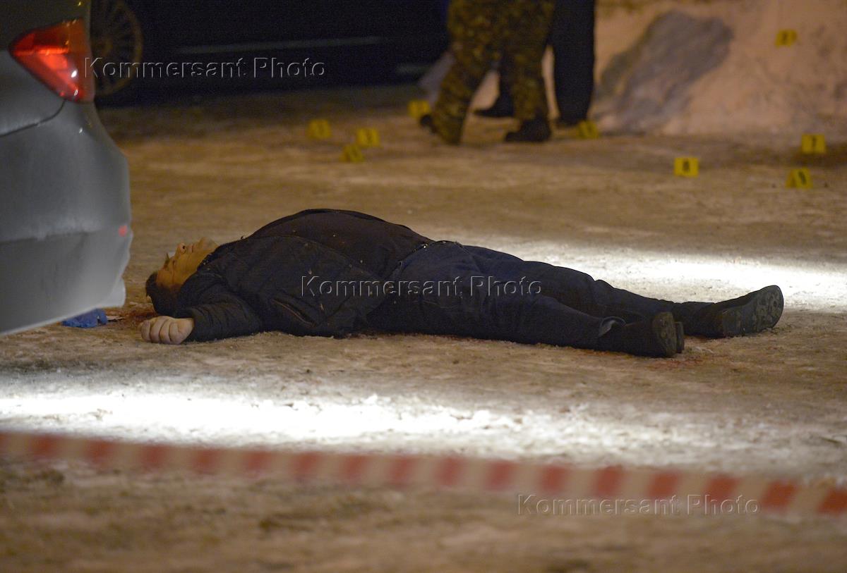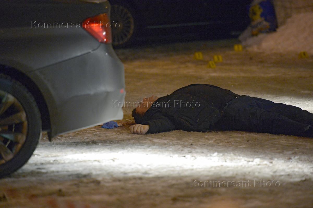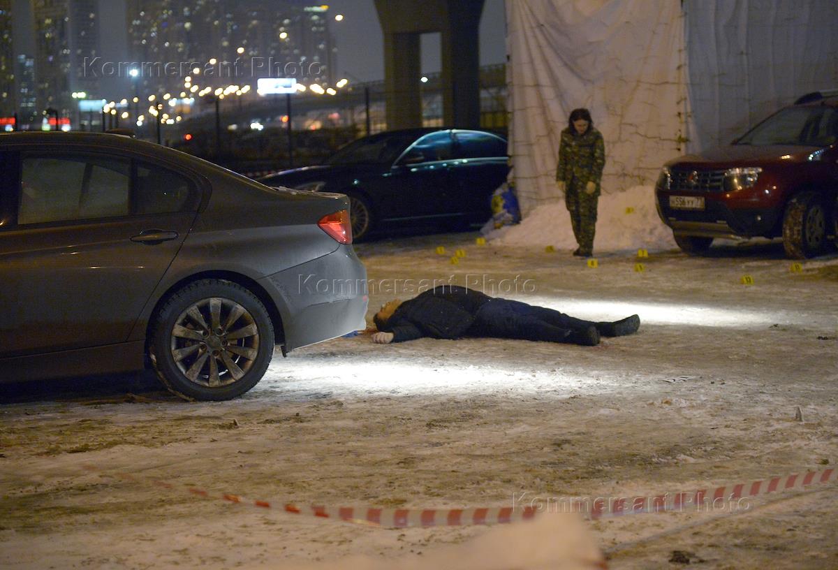 Место убийства предпринимателя Игоря Меклера возле бизнес-центра в 1-м Магистральном переулке. Работа следственной группы на месте преступления.