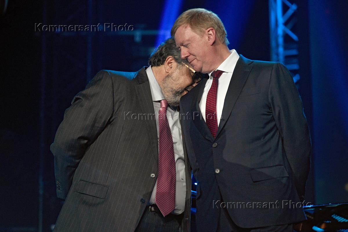Торжественная церемония вручения премии Егора Гайдара прошла в Московском театре юного зрителя (МТЮЗ). Председатель совета директоров инвестиционной компании "O1 Group Ltd" Борис Минц (слева) и председатель правления ОАО "РОСНАНО" Анатолий Чубайс (справа) во время церемонии.