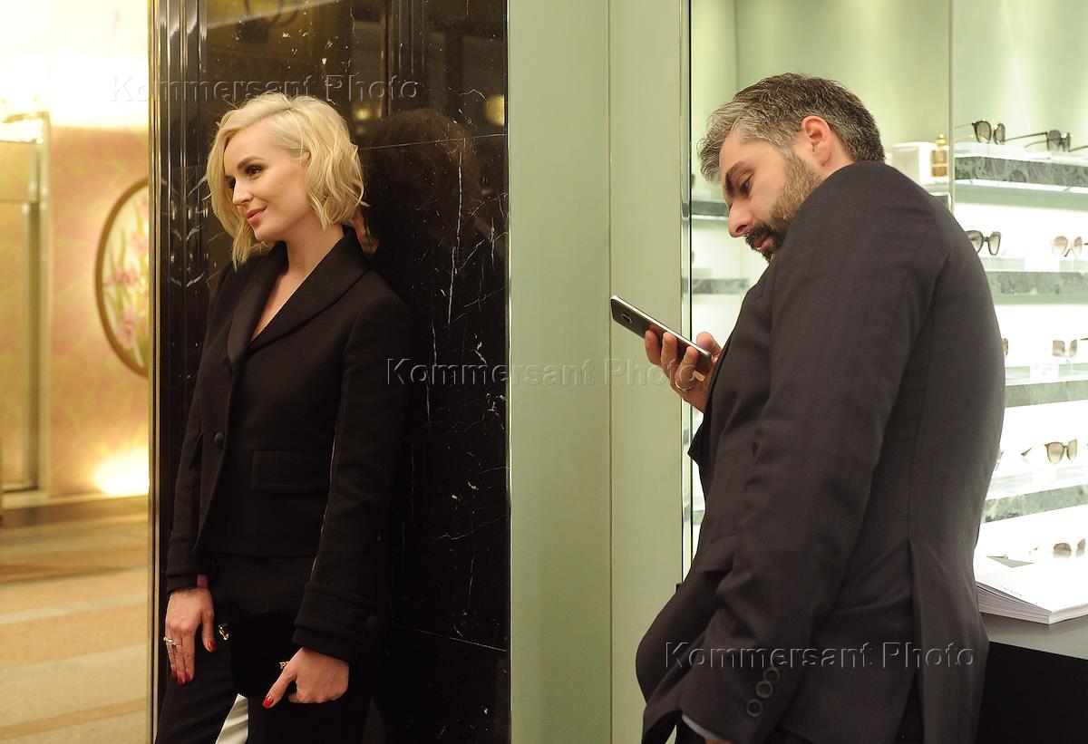 Певица Полина Гагарина (слева) и фотограф, дизайнер Дмитрий Исхаков (справа) на коктейле перед закрытым показом короткометражного фильма Дэвида О.Рассела, в рамках международного проекта Past Forward Prada в бутике Prada.