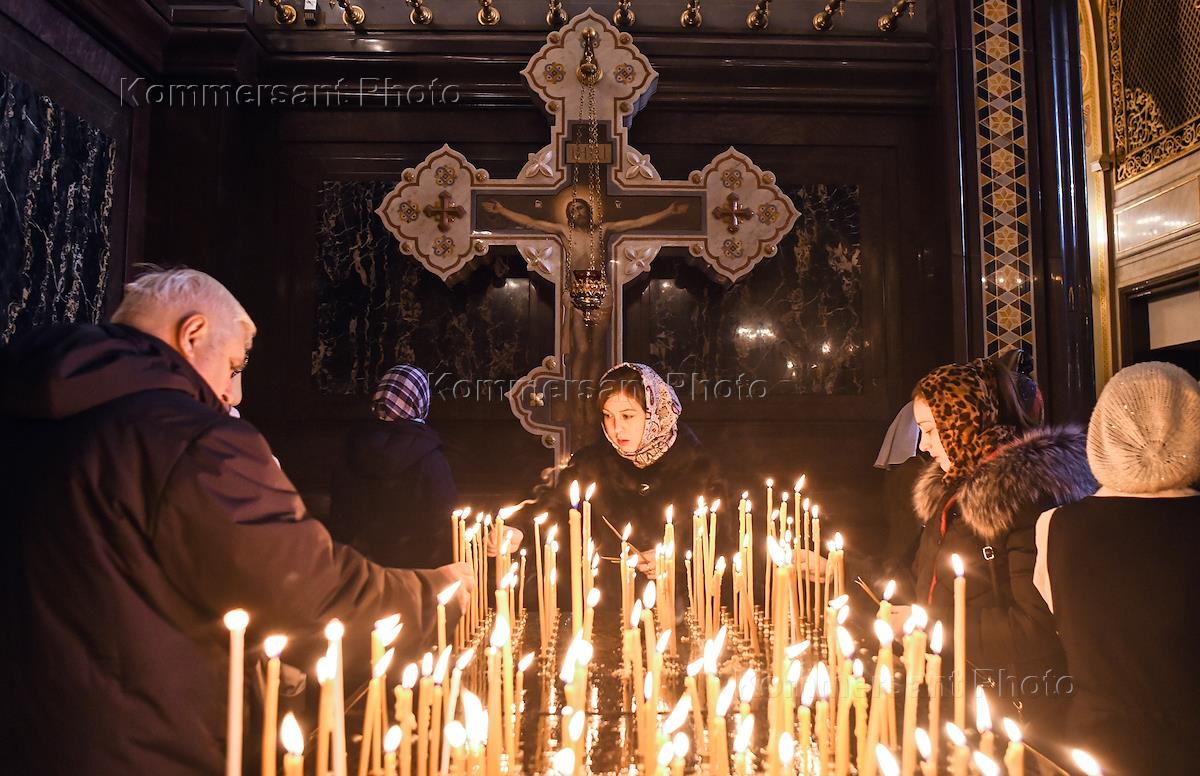 Believers attend a Divine Liturgy on Patriarch Kirill of Moscow and All Russia 70th birthday at the Cathedral of Christ the Savior.