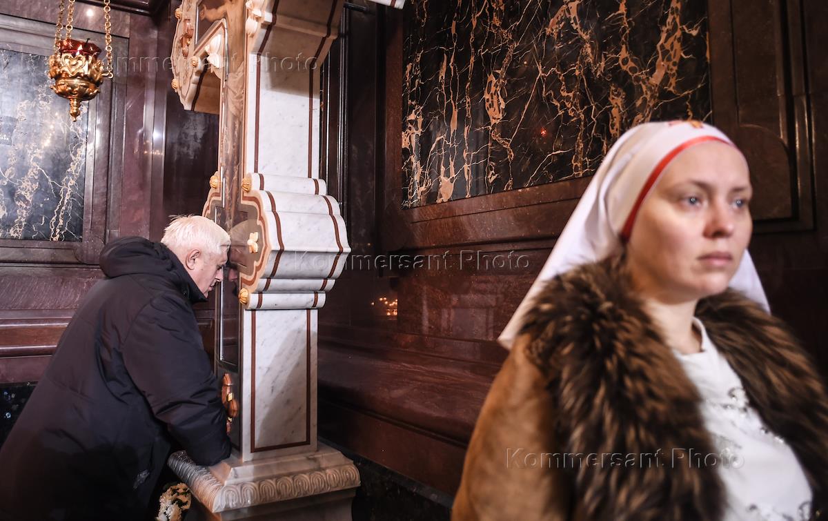 Believers attend a Divine Liturgy on Patriarch Kirill of Moscow and All Russia 70th birthday at the Cathedral of Christ the Savior.