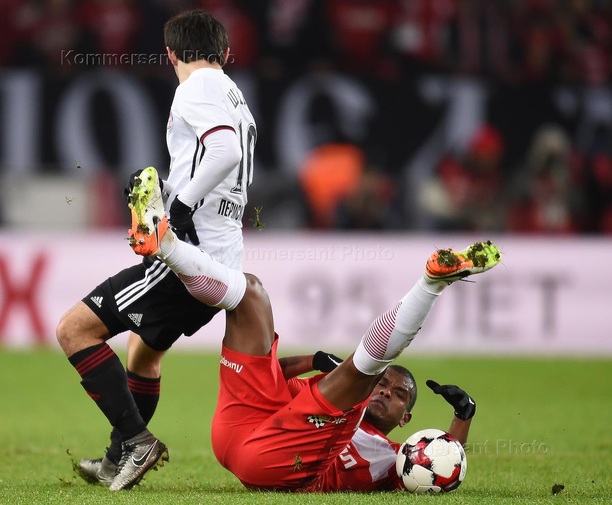 Чемпионат России по футболу. Премьер-лига. Матч между командами "Спартак" (Москва) - "Амкар" (Пермь) на стадионе "Открытие Арена". Игрок команды "Спартак" Квинси Промес (слева) и игрок команды "Амкар" Петар Занев (справа) во время матча.