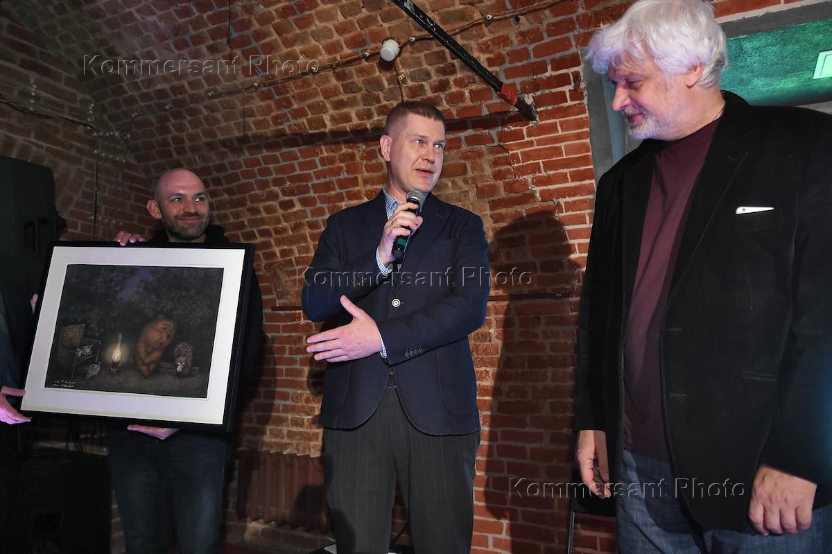 Финал конкурса драматургии "Кульминация" прошел в Боярских палатах СТД России. Председатель президиума Фондом развития современного искусства (ФРСИ), продюсер Иван Демидов (слева) и редактор отдела культуры Медиахолдинг "Эксперт" Вячеслав Суриков (справа) во время церемонии награждения финалистов конкурса.