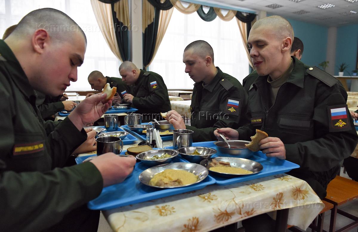 Церемония отправки к месту прохождения военной службы граждан, призванных в ходе осенней призывной кампании 2016 года, в Областном сборном пункте Военного комиссариата Московской области. Призывники в столовой.