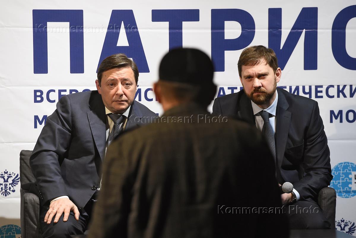 Всероссийский патриотический межнациональный форум молодежи "Патриот" прошел в Еврейском музее и Центре толерантности. Заместитель председателя правительства России Александр Хлопонин (слева) и глава Федерального агентства по делам национальностей России Игорь Баринов (справа) на форуме.