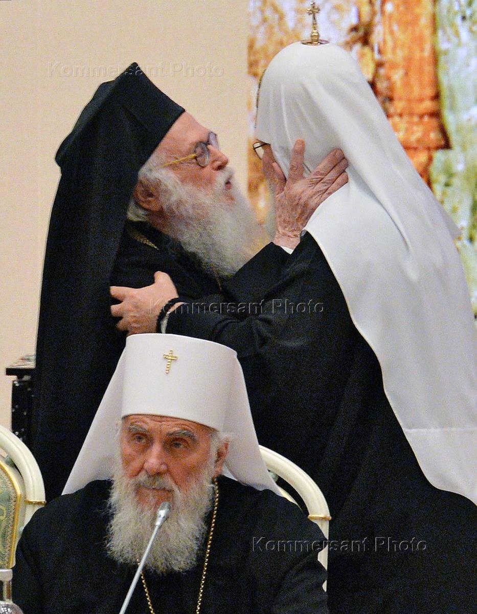 Archbishop of Tirana and All Albania Anastasios (left) attends the congratulation ceremony on Patriarch Kirill of Moscow and All Russia birthday in the Church Meeting Hall of the Cathedral of Christ the Savior.