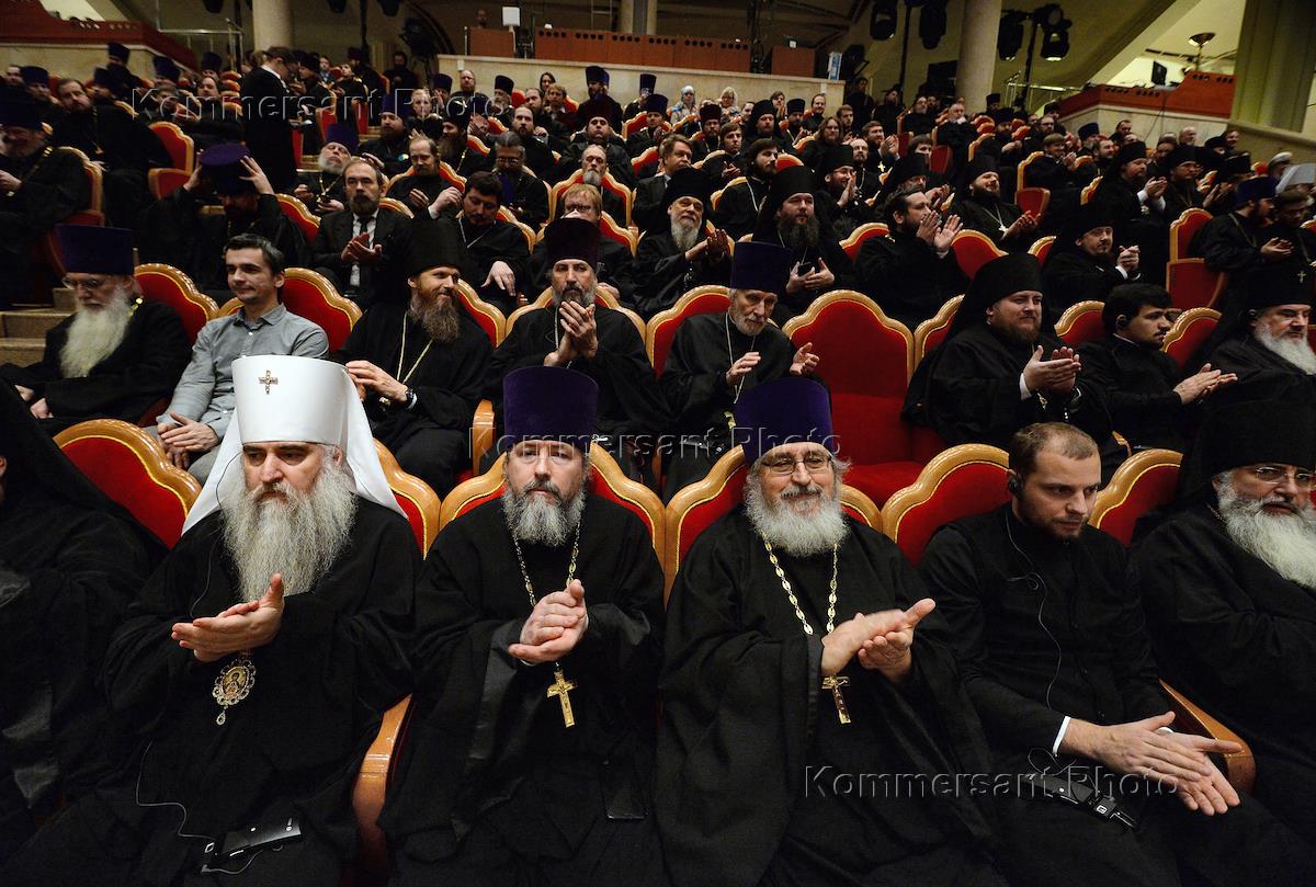 Representatives of local Orthodox churches attend the congratulation ceremony on Patriarch Kirill of Moscow and All Russia birthday in the Church Meeting Hall of the Cathedral of Christ the Savior.