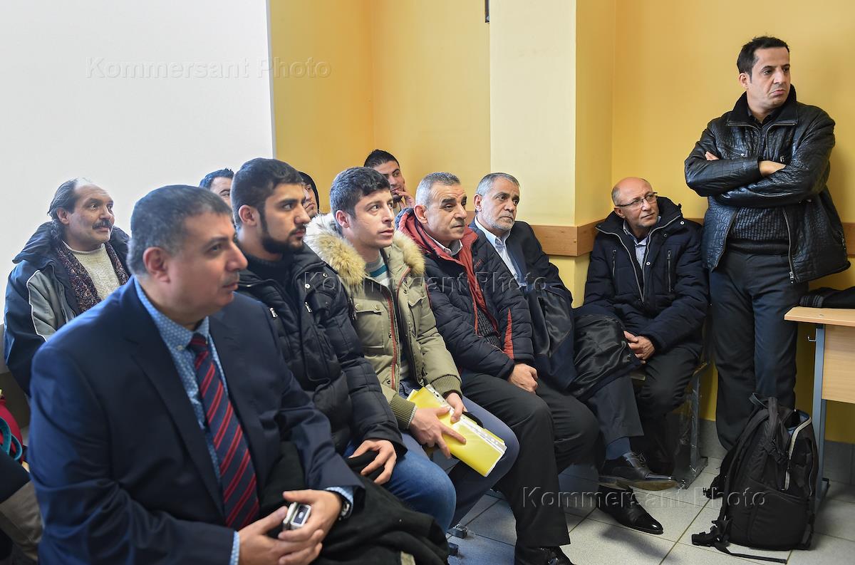 Fathers attend a parent-teacher conference during the opening of the school for Syrian refugees' children organized by non-profit charitable organization Civic Assistance Committee in the city of Losino-Petrovsky in Moscow region.