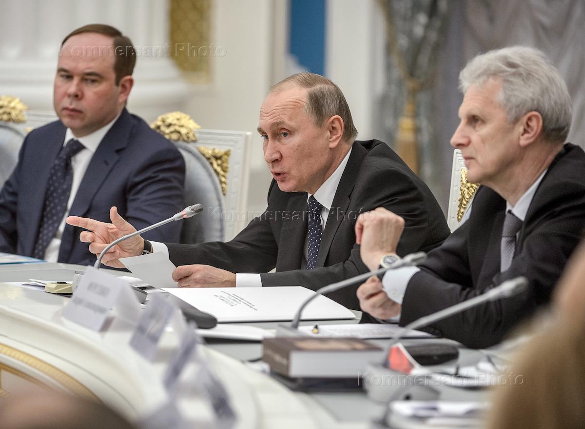 Заседание Совета по науке и образованию в Кремле. Слева направо: руководитель администрации президента России Антон Вайно, президент России Владимир Путин и помощник президента России Андрей Фурсенко во время заседания.