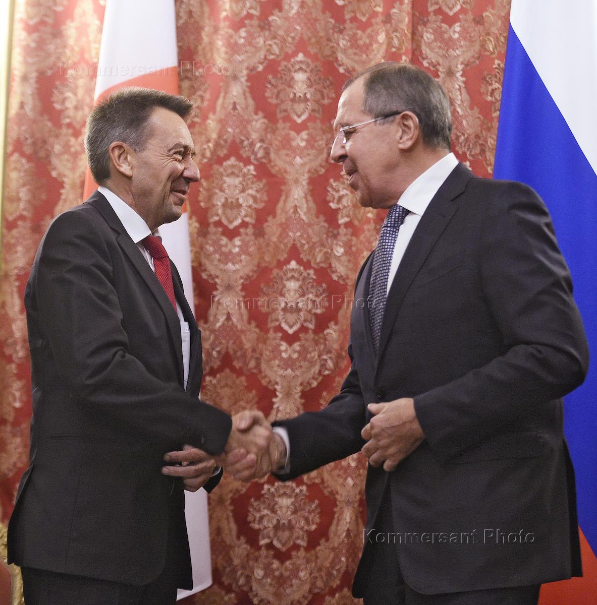 Министр иностранных дел России Сергея Лаврова (слева) и президент Международного Комитета Красного Креста в Петер Маурер (справа) перед началом встрече в особняке МИД.