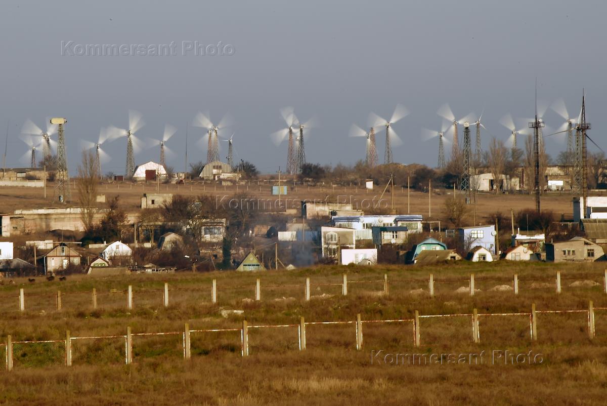 Жанровая фотография. Виды республики Крым. Новоозёрск. Новоозёрская ветроэлектростанция вблизи жилых домов.