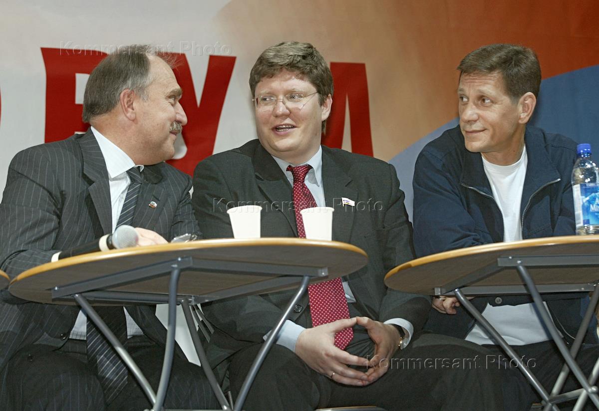 Руководитель фракции "Единство" в Государственной Думе Владимир Пехтин (слева), заместитель председателя Комитета Государственной Думы России по труду и социальной политике Андрей Исаев (в центре) и председатель Комитета Государственной Думы России по бюджету и налогам Александр Жуков (справа) на презентации всероссийской политической партии "Единство и Отечество" -"Единая Россия" в рамках общественно-политического форума "Народ и партии - лицом к лицу. Выборы 2003". Презентация состоялась в выставочном зале "Манеж