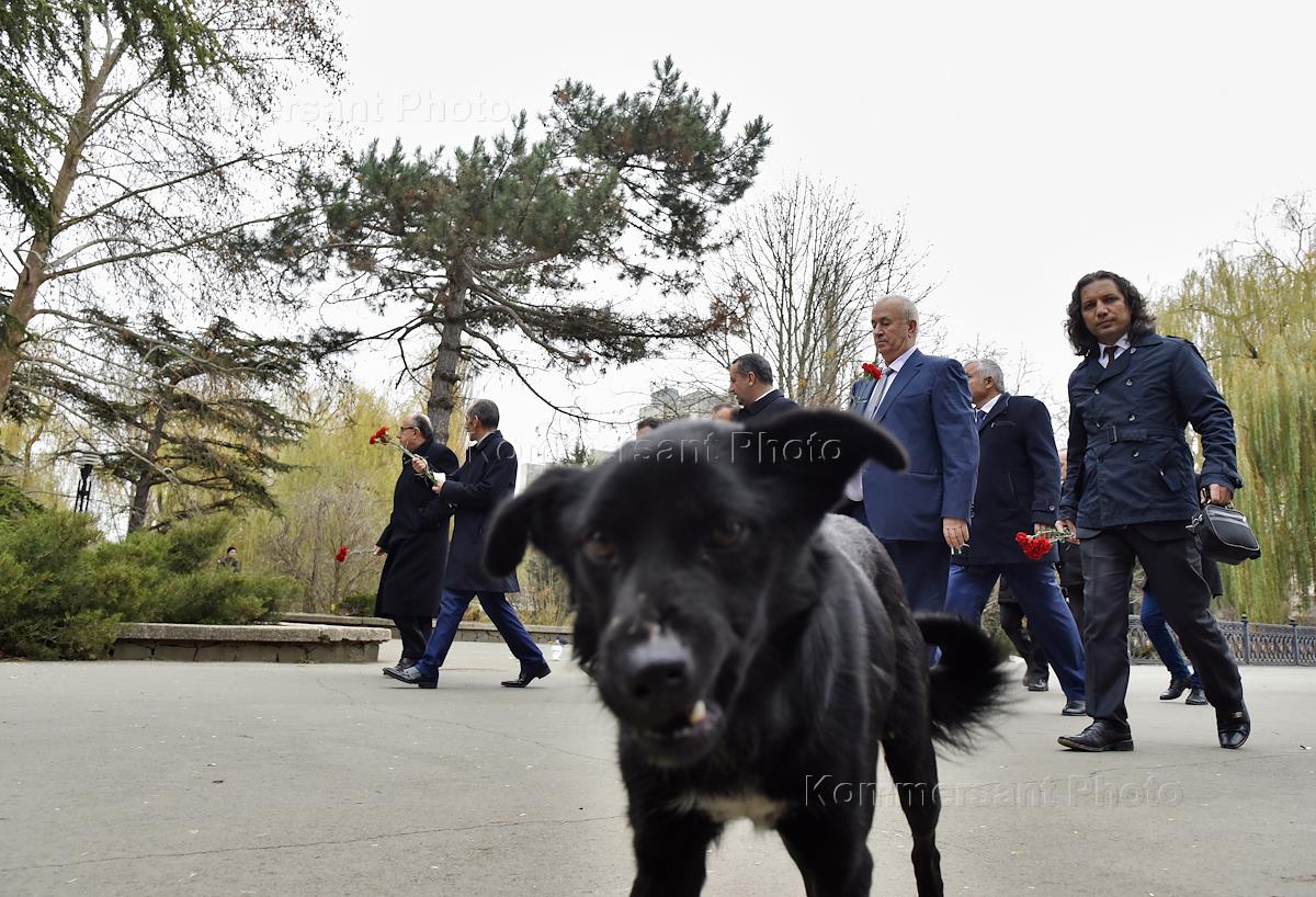 Делегация турецких политиков и представителей бизнес-кругов во время церемонии возложения цветов к вечному огню в Гагаринском парек Симферополя.