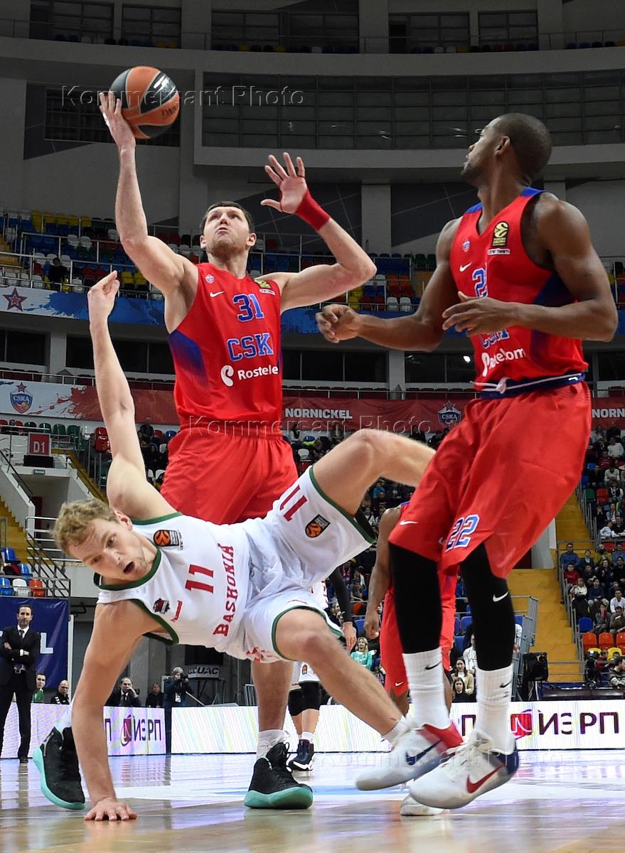 Евролига по баскетболу. Матч между командами ЦСКА (Москва, Россия) - "Баскония" (Испания) прошел во Дворце спорта "Мегаспорт". Игрок команды ЦСКА Никита Курбанов (слева) во время матча.