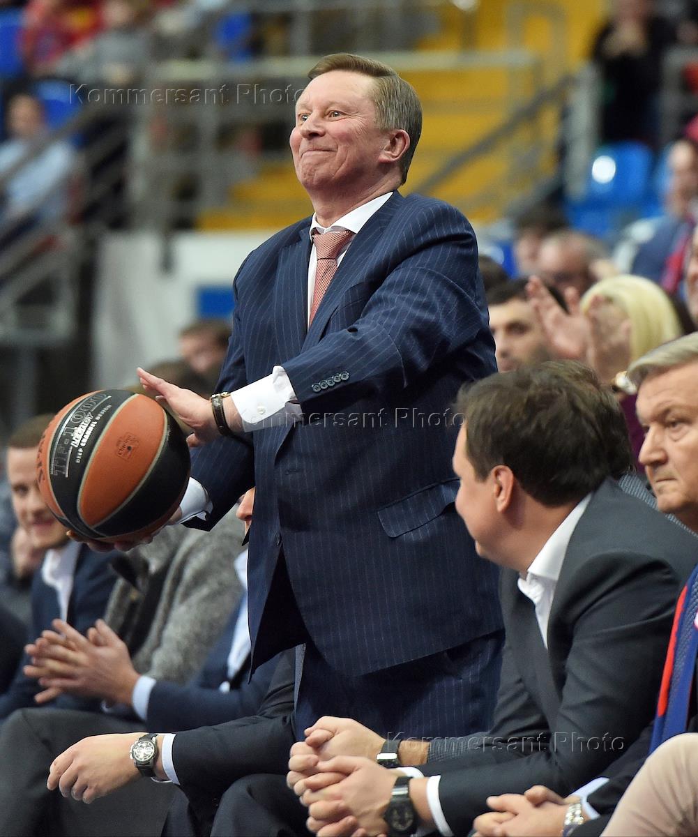 Евролига по баскетболу. Матч между командами ЦСКА (Москва, Россия) - "Баскония" (Испания) прошел во Дворце спорта "Мегаспорт". Специальный представитель Президента России по вопросам природоохранной деятельности, экологии и транспорта Сергей Иванов (в центре) во время матча.