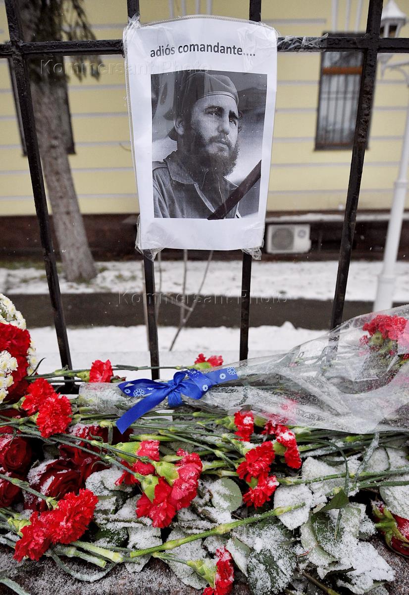 Moscow residents bring flowers and posters to the Cuban Embassy in Moscow as they gather to commemorate Cuba's revolutionary leader and former President Fidel Castro after the announcement of his death.