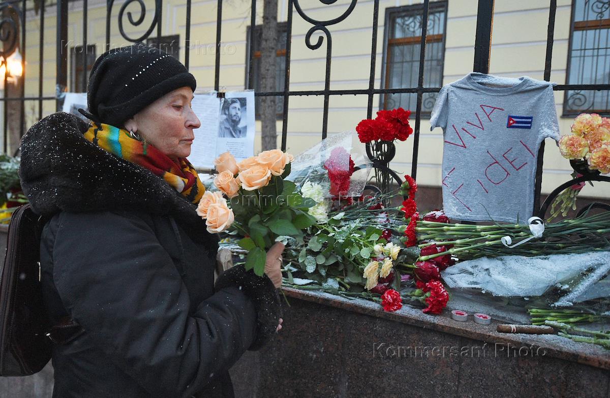 Жители города во время возложения цветов к посольству Кубы в связи с кончиной лидера кубинской революции Фиделя Кастро.