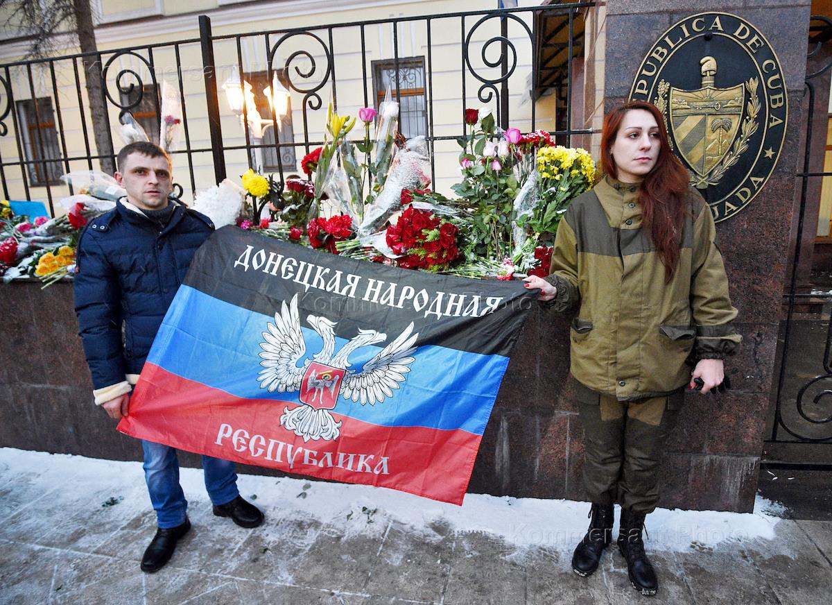 Люди несут цветы к посольству Кубы, прощание с Фиделем Кастро