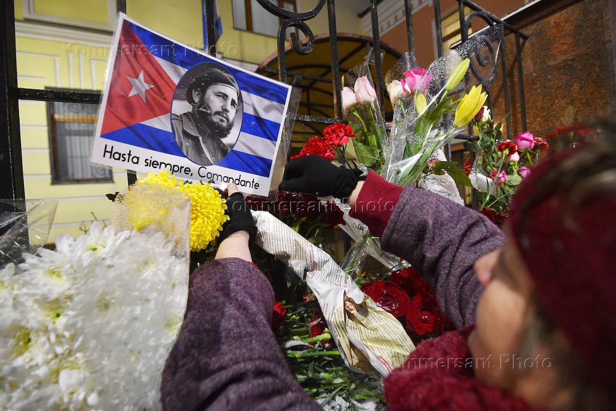 Цветы и фотография у посольства Кубы в связи с кончиной лидера кубинской революции Фиделя Кастро.