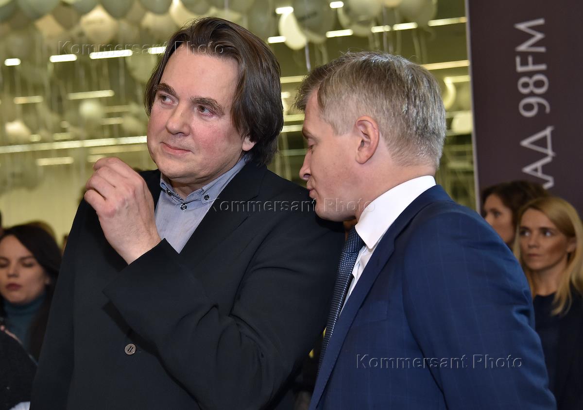 Празднование 20-го юбилея Мультимедиа Арт Музея (МАММ). Церемония VIP-открытия выставки Сергея Эйзенштейна "Монтаж аттракционов". Директор Центра современного искусства "Гараж" Антон Белов (справа) на праздновании.