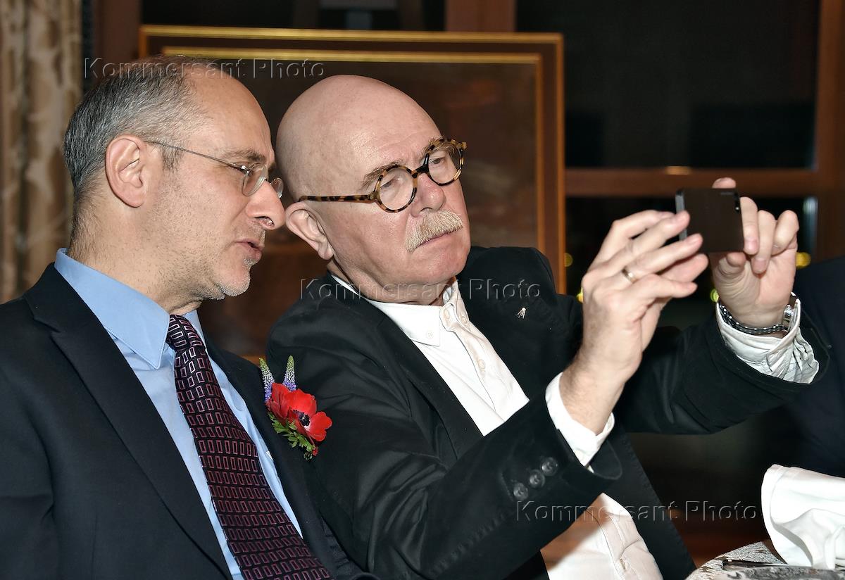 Искусствовед Михаил Каменский (слева) и архитектор Евгений Асс (справа) на торжественном ужине, посвященном празднованию пятилетия Института русского реалистического искусства в отеле Four Seasons.
